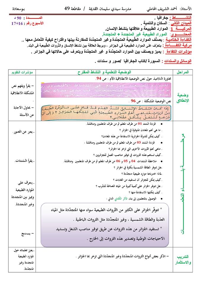 مذكرة الاسبوع السابع عشر 17 مادة الجغرافيا الموارد الطبيعية المتجددة وغير المتجددة السنة الرابعة ابتدائي الجيل الثاني Memorandum Geography Natural Resources
