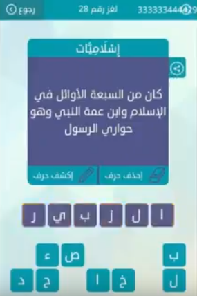 حل كان من السبعة الاوائل فى الاسلام وابن عمة النبى وهو حوارى الرسول لغز رقم 28 من لعبة وصلة للمجموعة صقور الإبدآع