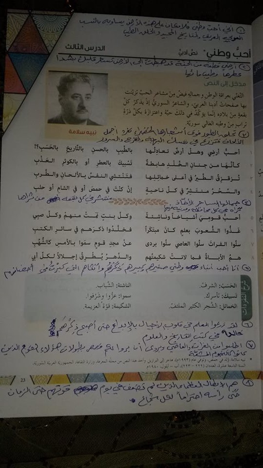 شرح وحل تدريبات قصيدة احب وطني للصف الثامن المنهاج السوري الجديد للشاعر نبيه سلامة