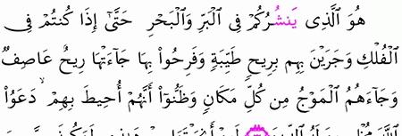 ه و ال ذ ي ي س ي ر ك م ف ي ال ب ر و ال ب ح ر ح ت ى إ ذ ا ك ن ت م ف ي ال ف ل ك و ج ر ي ن ب ه م ب ر يح ط ي ب ة و ف ر ح وا ب ه ا ج اء ت ه ا ر يح ع اص ف و ج اء ه م ال م و ج م ن ك ل م ك ان و ظ ن وا أ ن ه م أ ح يط ب ه م د ع و ا